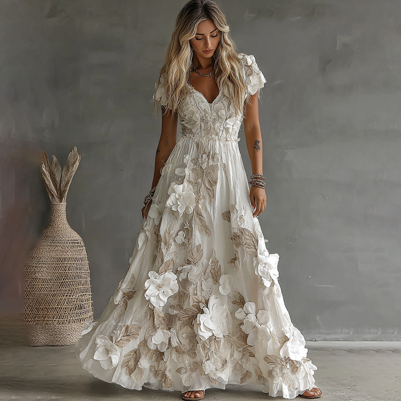 Women's Vintage Boho Floral Art Short-sleeved Maxi Dress