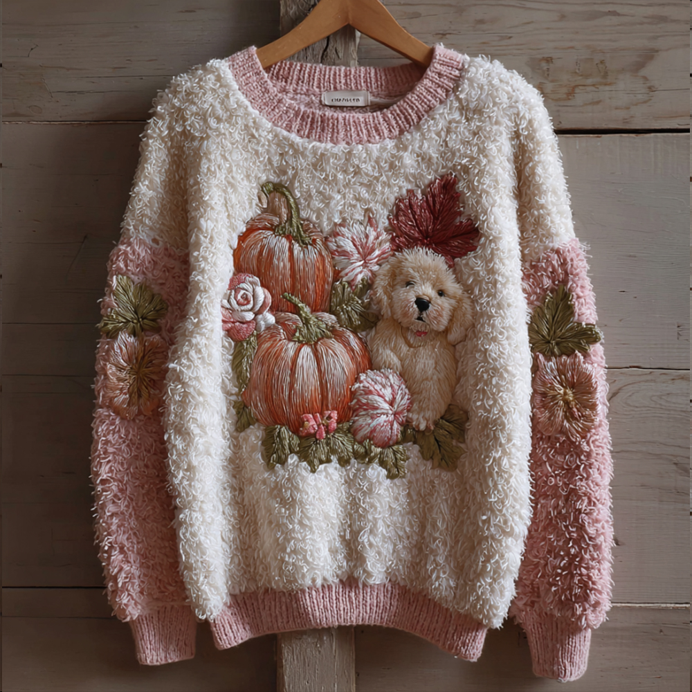 Lovely Fuzzy Dog & Pink Pumpkin Cozy Knit Sweater